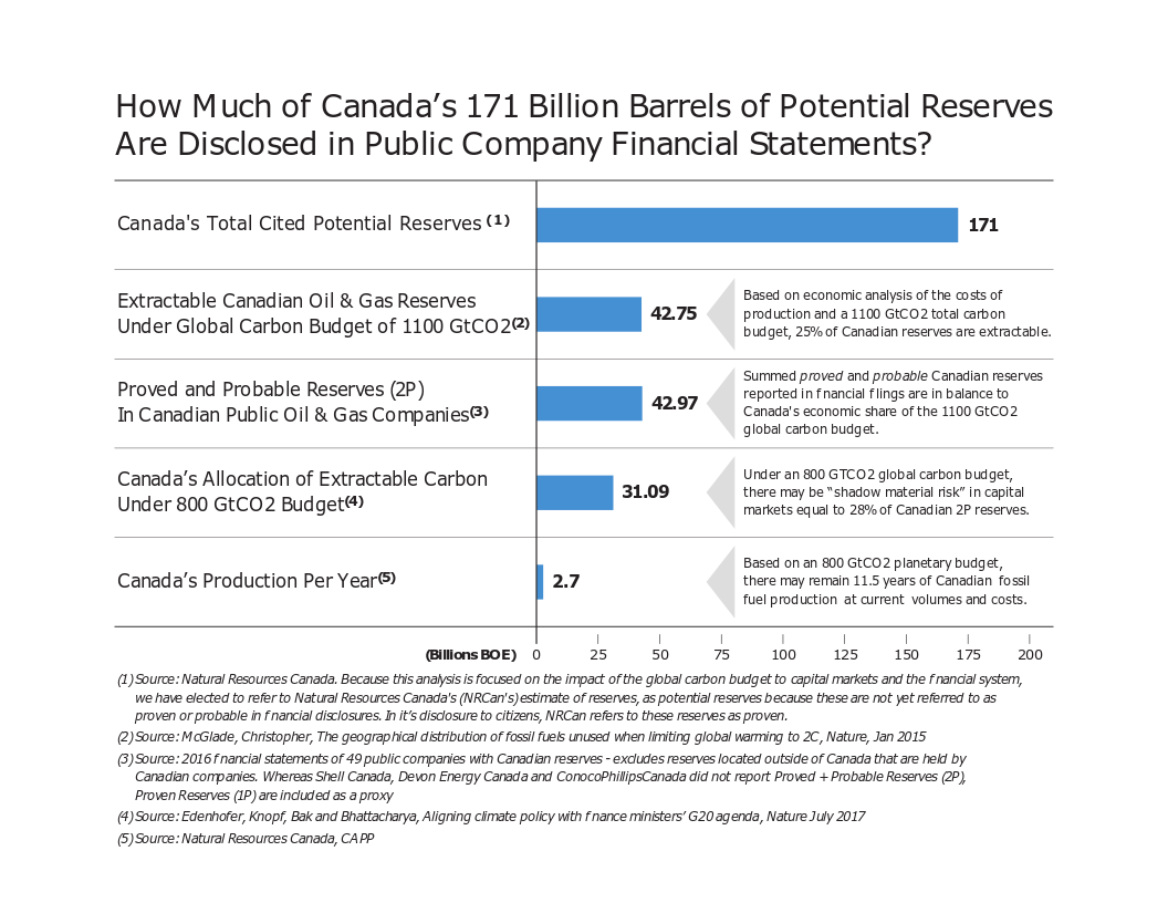 The global carbon budget for this model was capped at 1,100 Gigatonnes (Gt) of GHG emissions from now until 2100. The result of this model for Canada translates as follows: 42.75 billion barrels of oil equivalent (BBOeq) of possible extraction until 2100, which is close to the proved and probable reserves disclosed by 49 Canadian oil & gas companies in June 2017.