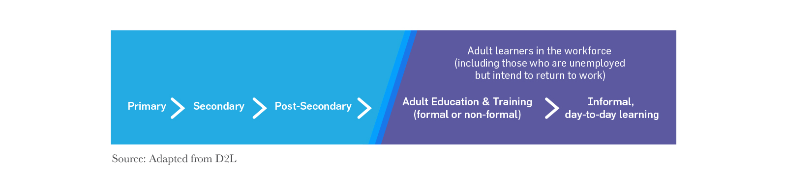 Looking to enhance skills or transition careers, these learners are increasingly turning to lifelong learning opportunities. A massive emerging cohort of working-age adults who will need to learn, upskill and retrain throughout their careers will reinforce trends that were already driving a new lifelong learning paradigm.[3] This presents an opportunity for Ontario’s higher education institutions at a time when they are coping with declining public investment, skepticism over their relevance in a changing labour market, and a pandemic that has shuttered campuses.