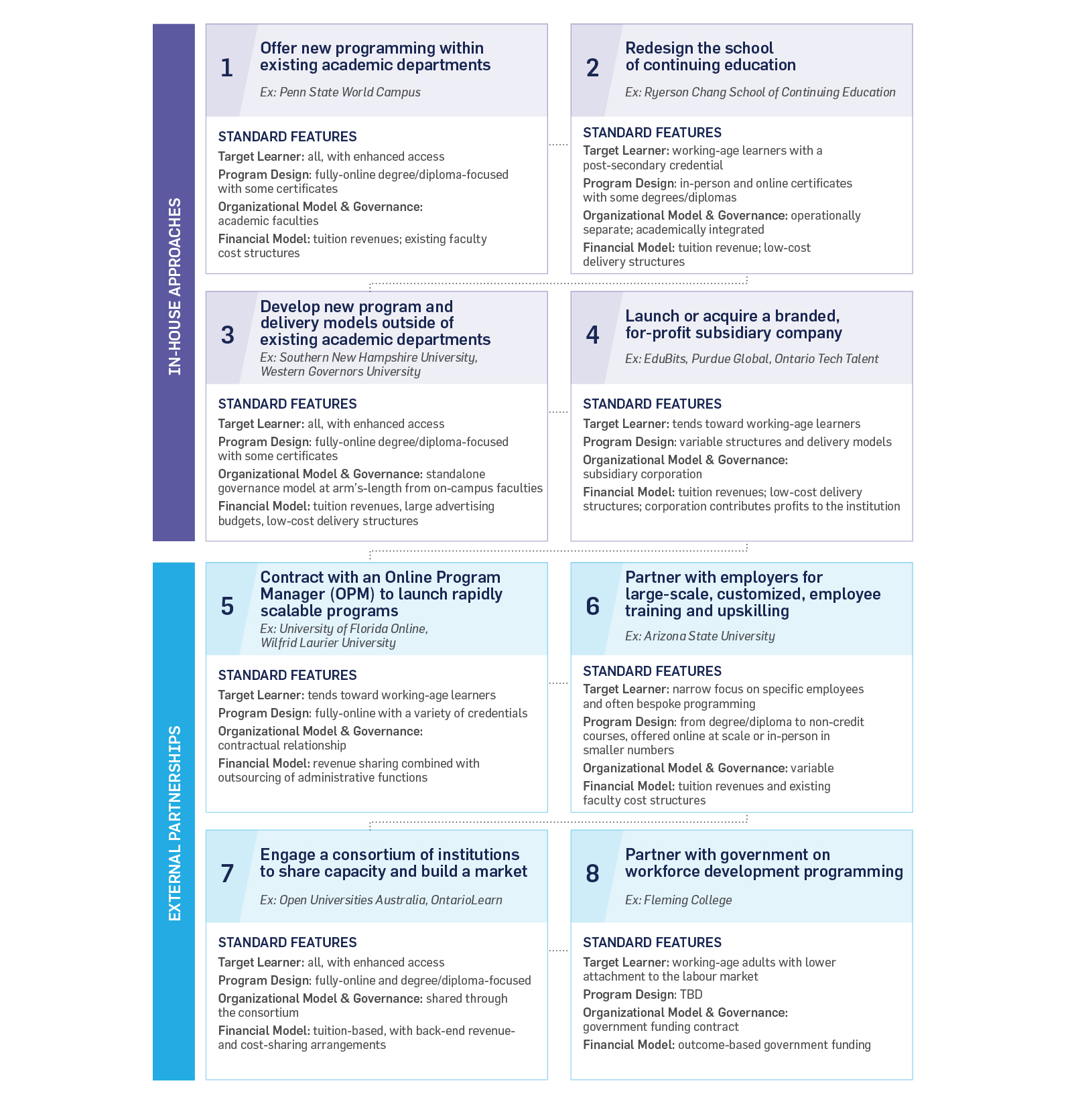 For those post-secondary institutions considering becoming more active in the world of lifelong learning, there are various models in Ontario and internationally from which to draw. We group our analysis into eight emerging models that are divided into two categories: in-house approaches developed under the full control of the institution, and external partnerships where the institution leverages its shared interests with the private sector, government or other institutions.