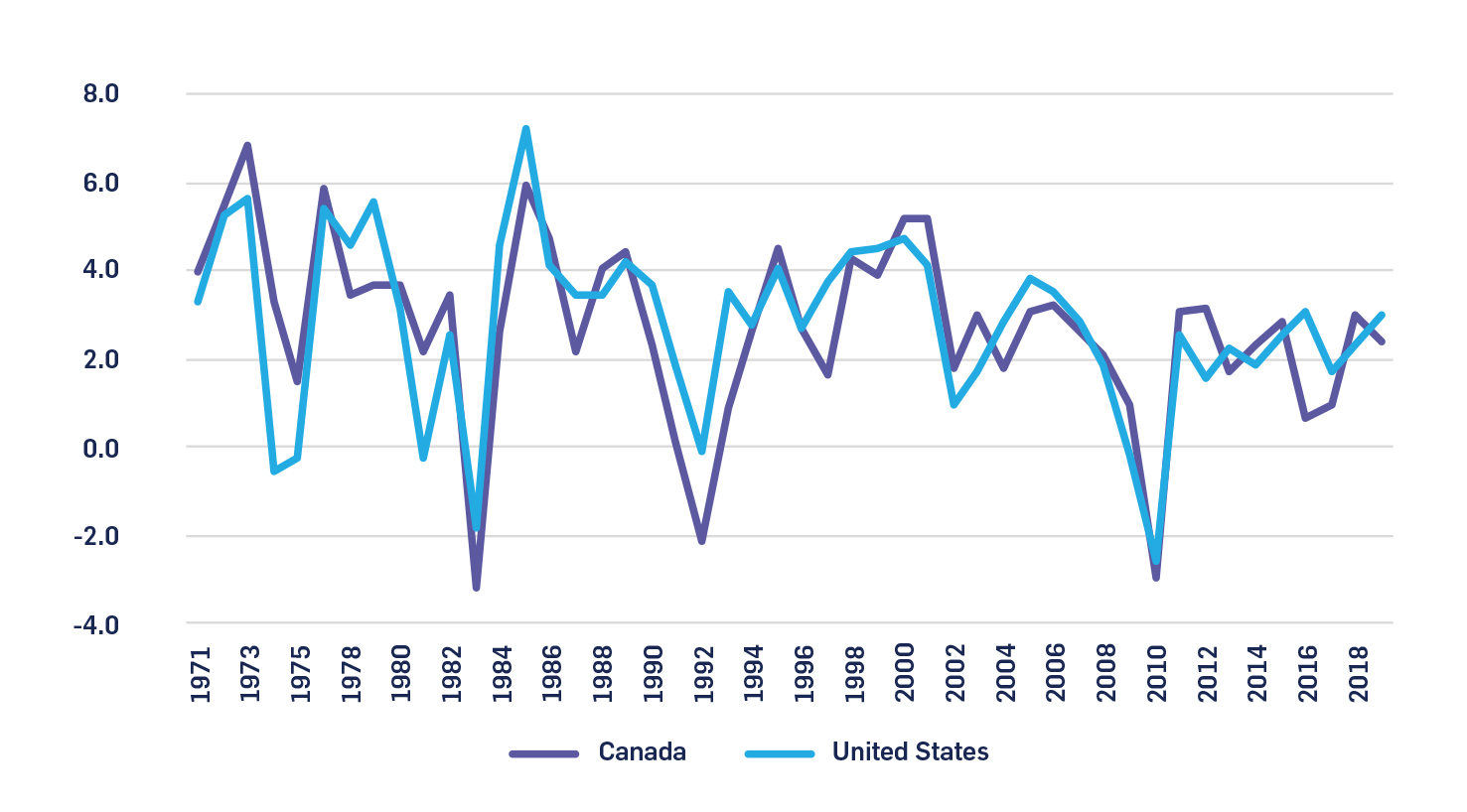 Figure 2: Real GDP Growth, Canada and the United States, 1971 to 2019