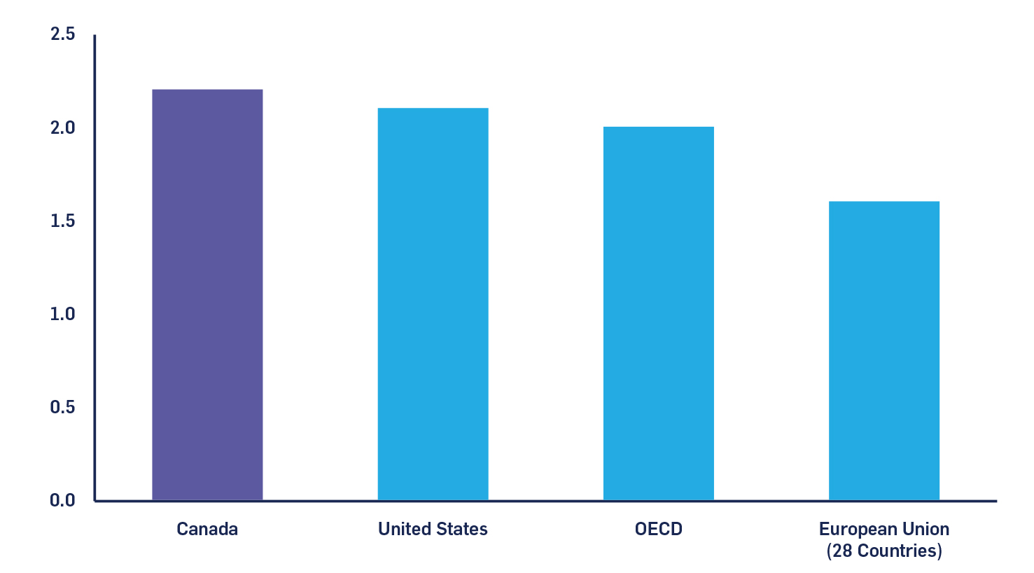 Canada’s rate of economic growth has slowed in recent decades. Consider, for instance, that the average growth rate per decade has generally fallen from nearly 6 percent in the 1960s to just over 2 percent since 2000.[3] We are not alone in this regard. Most advanced economies have experienced sluggish growth over the past two decades or so. The U.S. economy, for instance, has similarly averaged about 2 percent annual growth since the beginning of this century.[4]