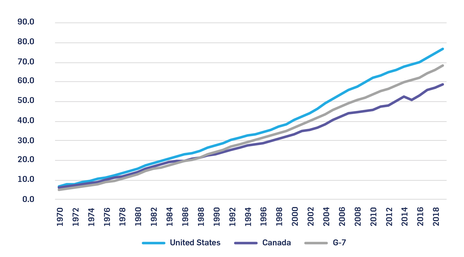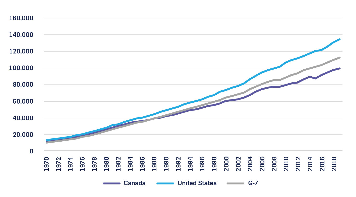 Canada’s productivity performance over the past 50 years has lagged its peer jurisdictions. In 1970, its GDP per hour worked was barely $1 less in output than in the United States and was actually $1 more in output relative to the G-7 average. By 2019, Canada’s GDP per hour worked was $18.10 less than the United States and $9.50 less than the G-7 average (see Figure 4).