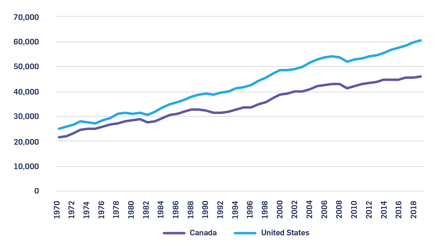 Figure 6: Level Of GDP Per Capita, Canada and the United States, (PPP $USD 2015), 1970 to 2019