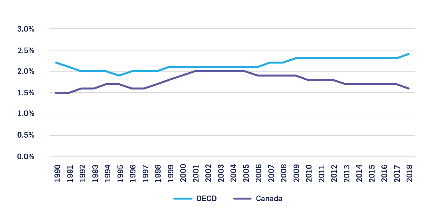 Figure 9: Gross Domestic Spending on Research and Development, OECD Average and Canada, 1990-2018