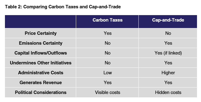 There are a variety of ways in which the two systems may be compared. Carbon taxes fix the price on emissions and lets the market determine the quantity; cap-and-trade fixes the quantity and lets the market determine the price. If one favours certainty over a region’s emissions, this is a point in favour of a cap-and-trade system. If one values the certainty over the price, which tends better enable longer-term business investment decisions, then this is a point in favour of carbon taxes.