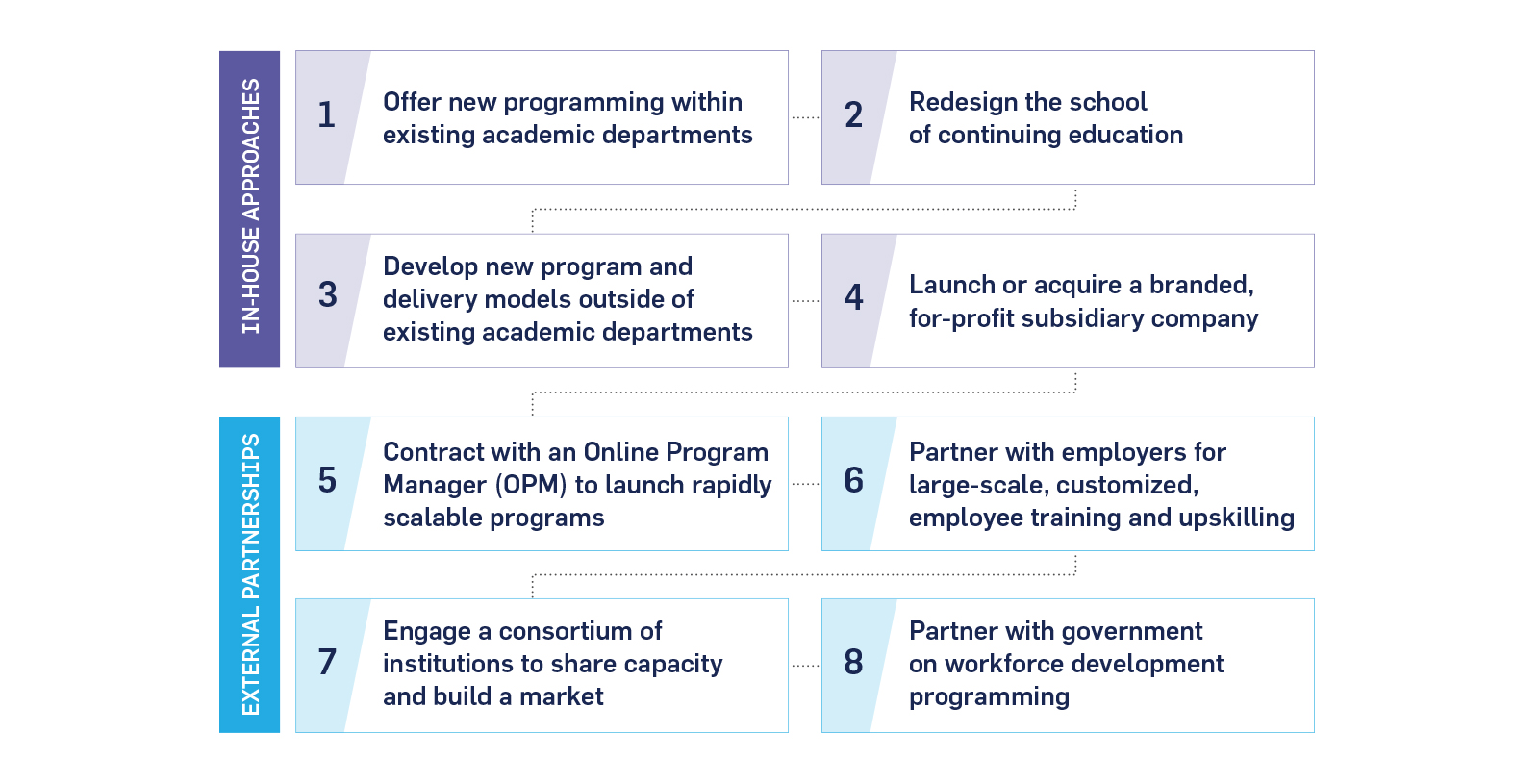 In this section we survey how public and non-profit higher education institutions in Ontario and internationally are expanding their offerings for working-age lifelong learners. We group the analysis into eight emerging models that are roughly divided into two categories: