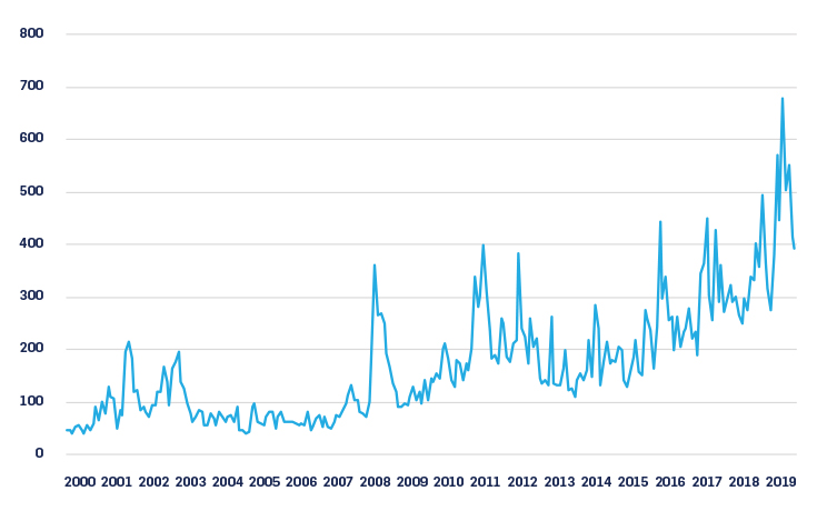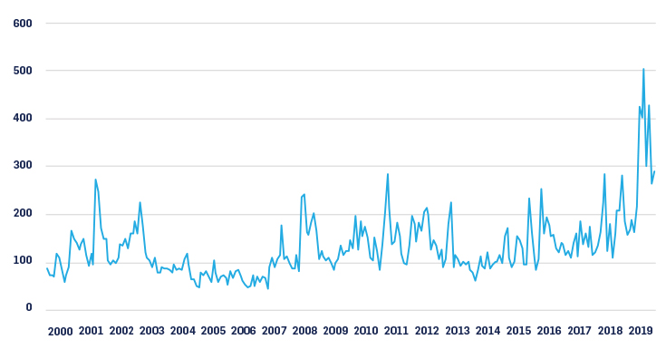 Figure 2: Monthly Economic Policy Uncertainty Index, United States, January 2000 To September 2020[5]