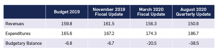 Budget-making in an environment of heightened uncertainty is highly challenging. The basic inputs to a government budget are economic projections including real and nominal GDP growth, inflation, unemployment, and so on. These economic metrics are used to estimate revenues and expenditures. If there is a high degree of uncertainty embedded in these estimates, it can make it extremely challenging to produce reliable revenue and expenditure projections. Consider the revisions in Table 1. Within months, the government’s deficit projection has grown almost six-fold due to pandemic-induced changes to revenues and expenditures.