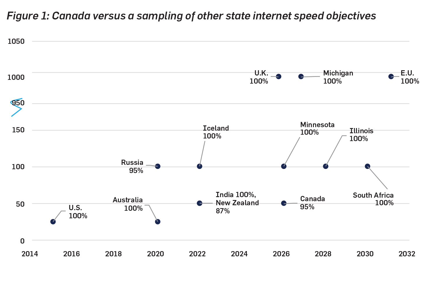 [1] Data for Canada from High-Speed Access for All: Canada’s Connectivity Strategy, by Innovation, Science and Economic Development Canada (2020). Data for EU from 2030 Digital Compass: The European Way for the Digital Decade, by European Commission (2021). Data for Iceland from Parliamentary resolution on a twelve-year electronic communications plan for the years 2011-2022, by Althingi (2012). Data for Illinois from Connect Illinois: Broadband Strategic Plan, by Illinois Department of Commerce of Economic Opportunity (2020). Data for India from National Digital Communication Policy, by Government of India (2018). Data for Michigan from Michigan Broadband Roadmap, by Michigan Infrastructure Commission (2018). Data for Minnesota from Broadband Goals (2020). Data for New Zealand from Broadband and mobile programmes, by Ministry of Business, Innovation & Employment (n.d.). Data for Russia from “A Sector Assessment: Broadband in Russia,” by C.M. Rossotto, et. al., 2015, World Bank Group. Data for South Africa from South Africa Connect: Creating Opportunities, Ensuring Inclusion, by Republic of South Africa, Department: Communications (2013). Data for UK from National Infrastructure Strategy, by HM Treasury (2020).