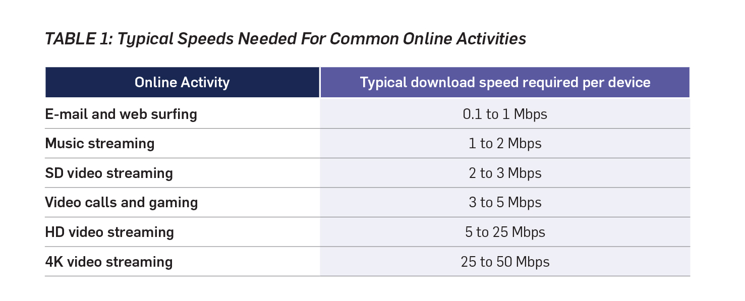 Yet that minimum standard (50/10) that many in Northern Ontario won’t have until five or six (or more?) years from now is already insufficient to the demand for internet capacity. The table below is from Rogers Communications Inc. It provides estimates of download speeds required for online activities, per device (speeds vary based on file size and quality).