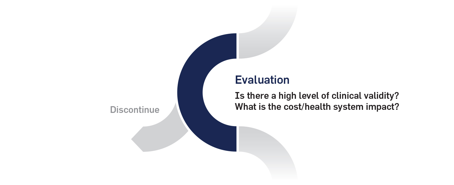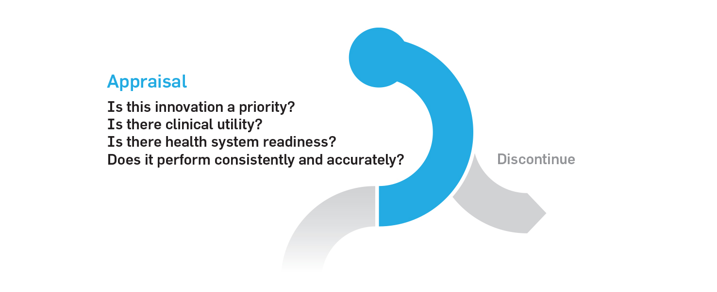 The appraisal phase provides a clear entry point into the pathway for new discoveries. At this step, innovations can be quickly assessed for clinical utility and prioritized for evaluation. Ones deemed successful at the appraisal phase would continue to the evaluation phase.