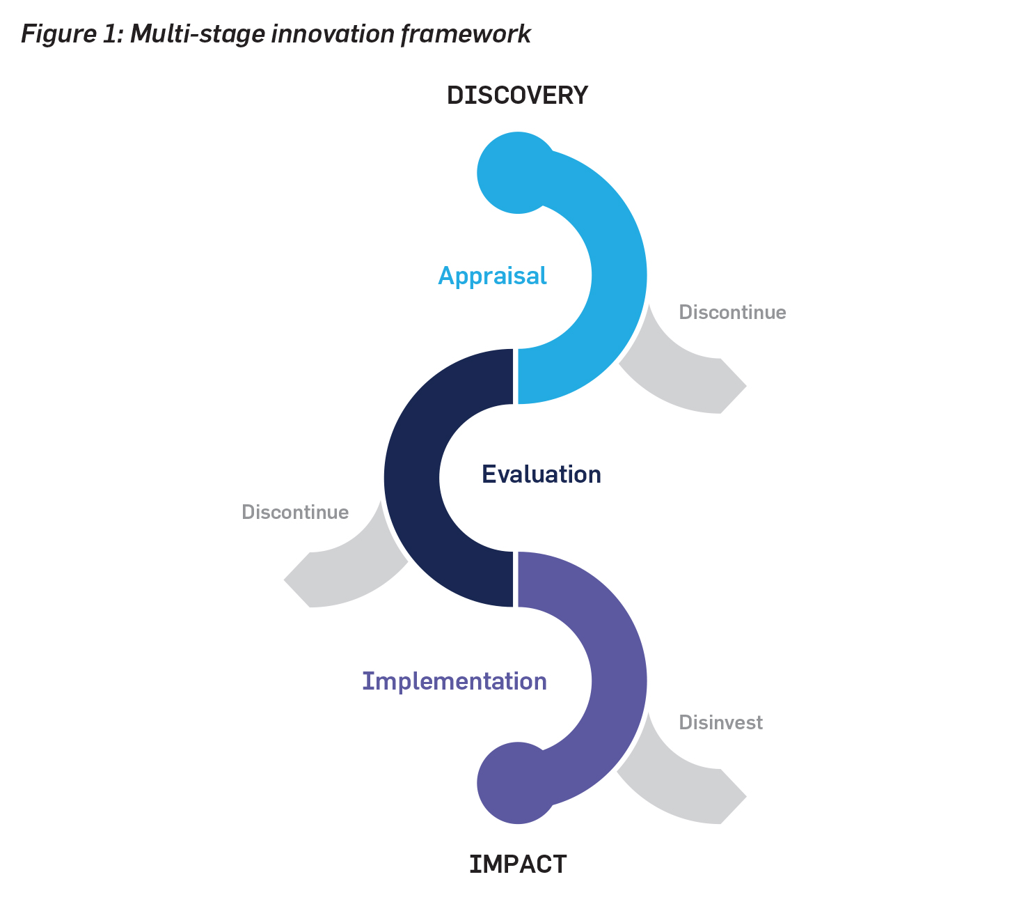 An innovation pathway framework to bridge between research discoveries and clinical impact would consist of three phases: (1) appraisal, (2) evaluation, and (3) implementation.