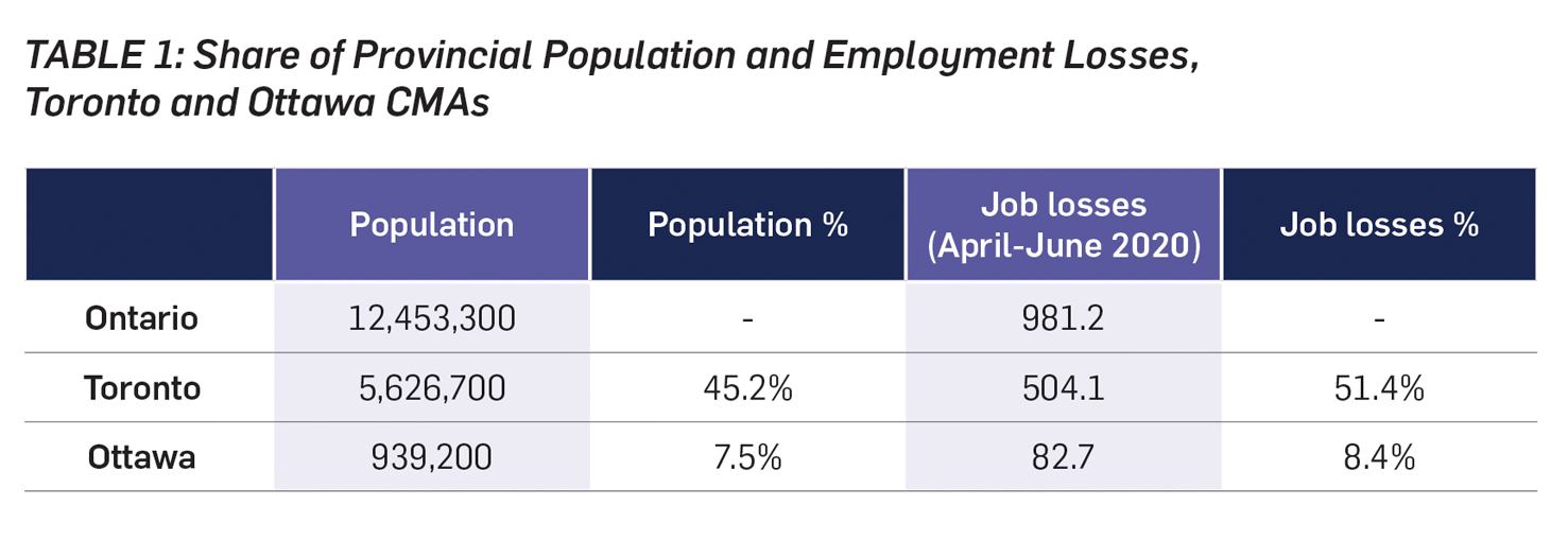 During the pandemic itself, the distribution of job losses was less concentrated in the province’s major cities. Of the more than 980,000 jobs lost across the province due to the pandemic between March and June 2020, 59.8 percent were concentrated in Toronto and Ottawa. The two cities comprise roughly 52 percent of Ontario’s population (see Table 1).